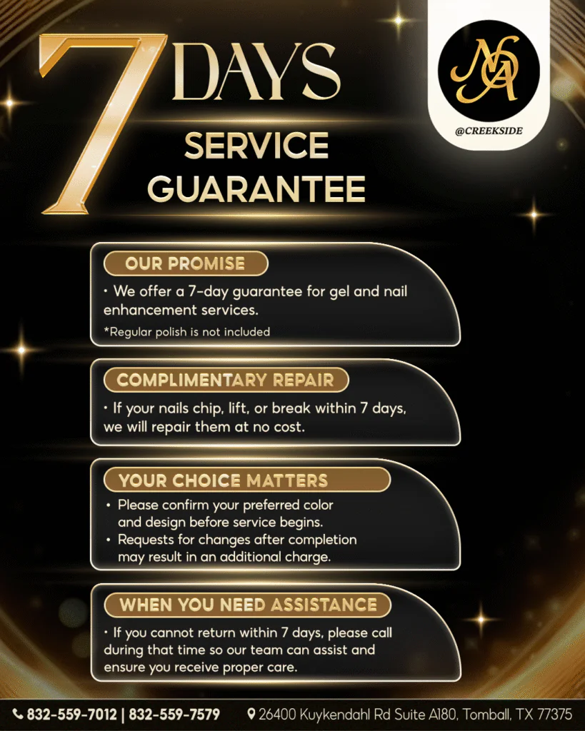 (optional) I consent to receive transactional SMS messages from Nail Of America CreekSide for appointment notifications and POS-related functions. Consent is not required for purchase. Message and data rates may apply, and the frequency of texts may vary. Reply STOP to unsubscribe.